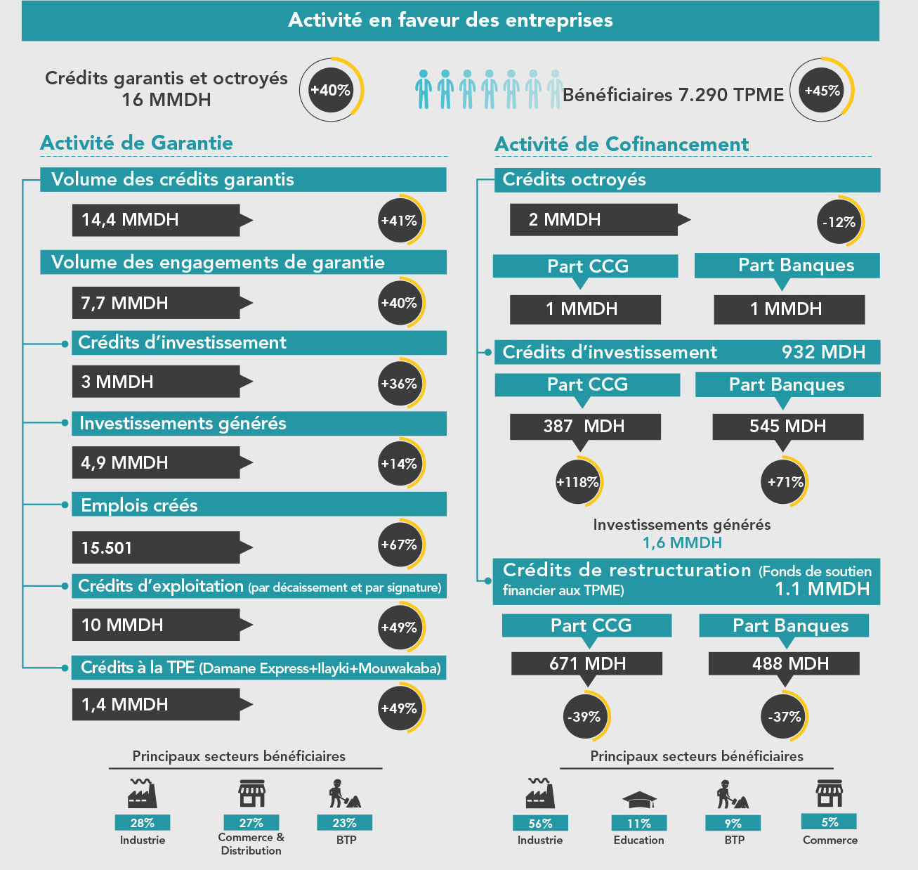 L’activité en faveur des entreprises a poursuivi son trend haussier totalisant à fin 2016, un volume de crédits garantis et octroyés s’élevant à plus de 16 milliards de DH, soit une hausse de 40%.
