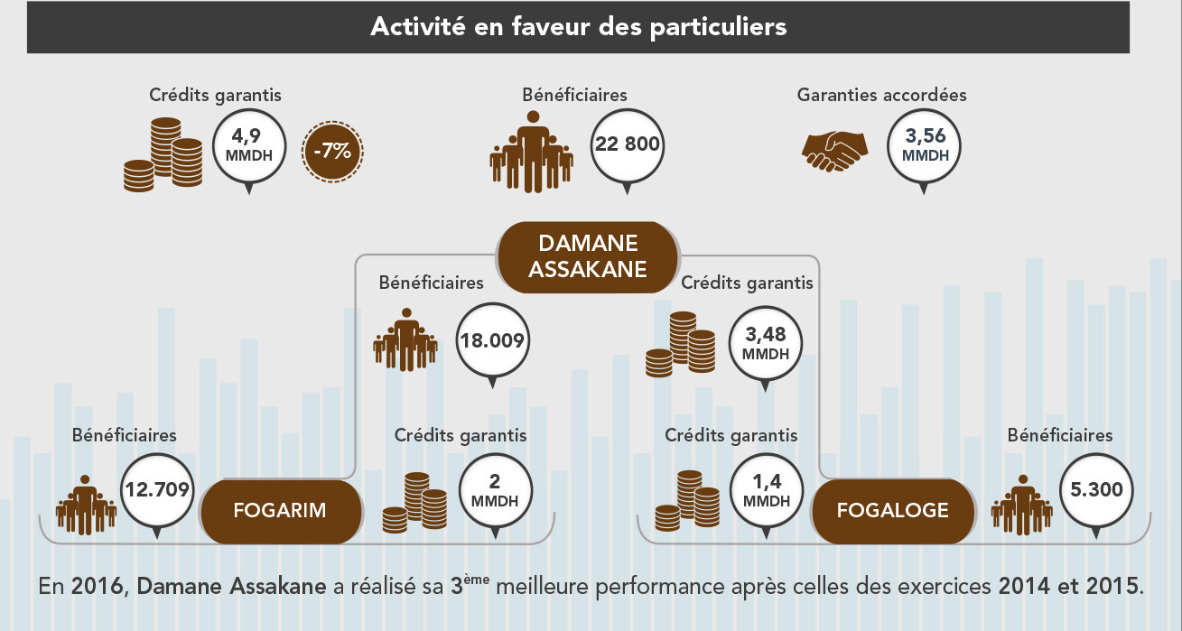 L’activité en faveur des particuliers a permis en 2016, de mobiliser une enveloppe de crédits de 4,9 milliards de DH, en baisse de 7% par rapport à 2015, et ce, en faveur de 22.800 bénéficiaires. Le volume des garanties accordées a atteint 3,56 milliards de DH.